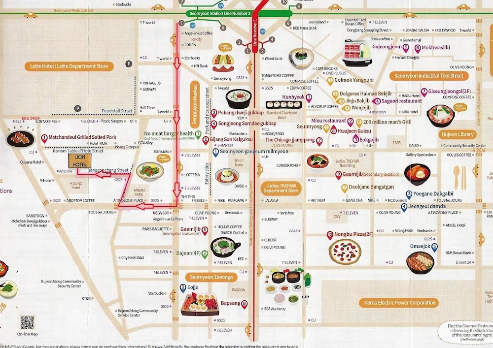 Met een verblijf bij Lion Hotel in Busan, in Seomyeon, bevind je je op 1 min. rijden van Warenhuis Lotte Busan en op 7 min. van Nampodong Street. Dit hotel ligt op 7,8 km van Strand van Gwangalli en op 13,5 km van Strand van Haeundae. Doe of je thuis bent in één van de 73 klimaatgeregelde kamers met een koelkast en een minibar. Dankzij gratis wifi blijf je online, terwijl de tv met kabelzenders zorgt voor het kijkplezier. De privébadkamers met aparte badkuipen en douches hebben elk diepe baden en gratis toiletartikelen. Bij de voorzieningen horen een bureau en een zitruimte en de kamers worden dagelijks schoongemaakt. Afstanden worden weergegeven tot op 0,1 mijl en kilometer.
